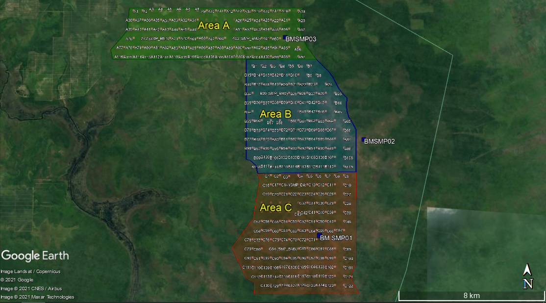 Lokasi pekerjaan ini berada di pedalaman Kabupaten Seruyan, Kalimantan Tengah sekitar 35 Km dari Sampit, Kabupaten Kotawaringin Timur, atau sekitar 140 Km dari Kota Palangkaraya. Luas total area pengukuran adalah 10.000 Ha. Vegetasi lokasi pemetaan didominasi oleh hutan lahan kering dan rawa dengan medan yang relatif datar, berpasir dan lahan gambut.