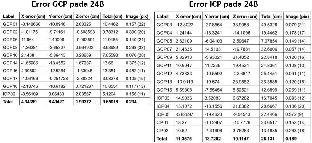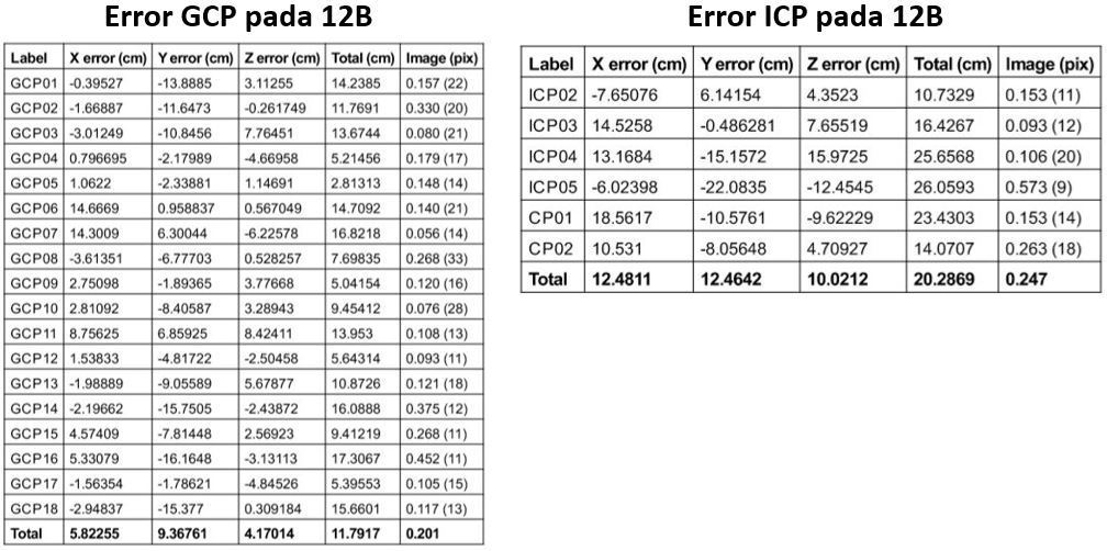 Proses selanjutnya adalah memasukkan nilai GCP pada premark foto udara sebagai titik ikat atau titik kontrol tanah. Konfigurasi GCP yang digunakan adalah 12B sebagai acuan awal sesuai standar pemetaan photogrammetry untuk ketelitian peta yang diinginkan. Didapat nilai error total GCP 11,79 cm atau 0,118 m dan error total ICP 20,28 cm atau 0,203 m. Error ICP adalah nilai yang digunakan untuk mengukur kualitas produk pemetaan. Detail error untuk masing-masing titik dapat dilihat pada tabel berikut.