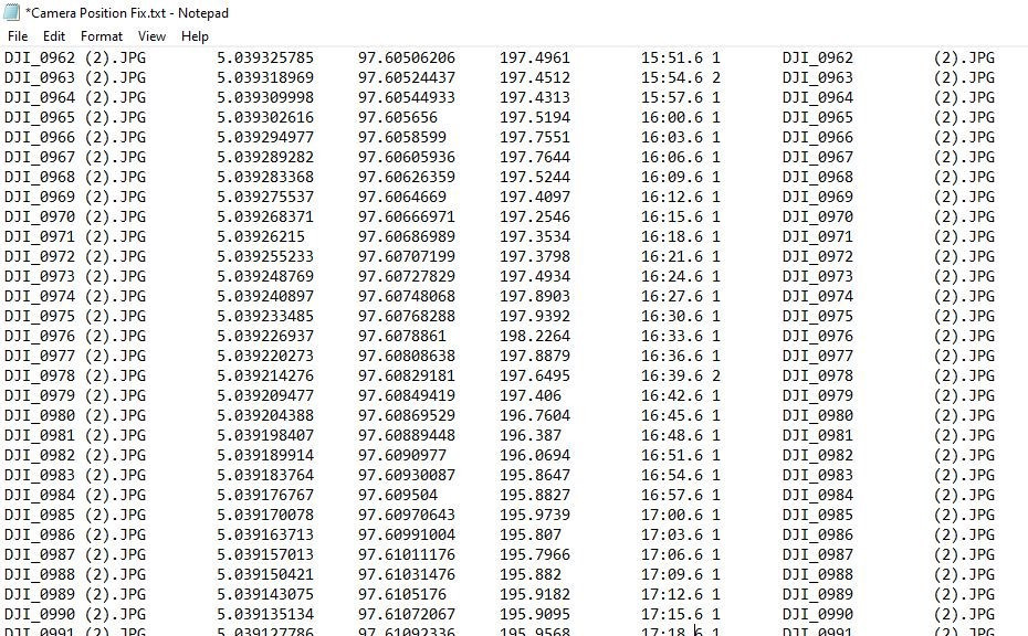 Proses yang paling penting pada metode ini adalah memastikan koordinat yang didapat dari EMLID Reach M+ sebagai koordinat foto sesuai dengan titik aslinya, pengolahan data GPS dilakukan dengan software RTKLib dengan hasil event post dari setiap misi penerbangan. Hasil tersebut kemudian diselaraskan dengan seluruh data foto yang ada menjadi format Nama Foto -  Lintang - Bujur - H Ellips. - Waktu, seperti gambar berikut.